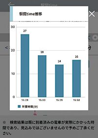 「駅間time」画面(直近2時間における実際の所要時間推移グラフ)
