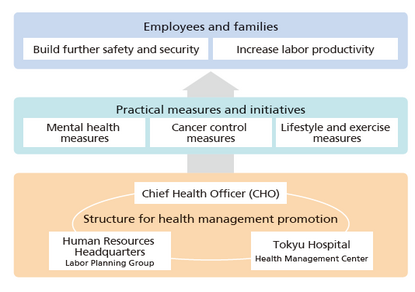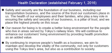 Inheriting this DNA, in 2016, Tokyu Group established the Health Declaration in order to promote management that pursues "health," which is essential to realizing the Group's Mission Statement, "to create beautiful living environments, in which each person can pursue individual happiness in a harmonious society." In the Health Declaration, we position health promotion as added value not only for our employees and their families, but also for our customers, and as something that leads to social contribution and the development of local vitality.